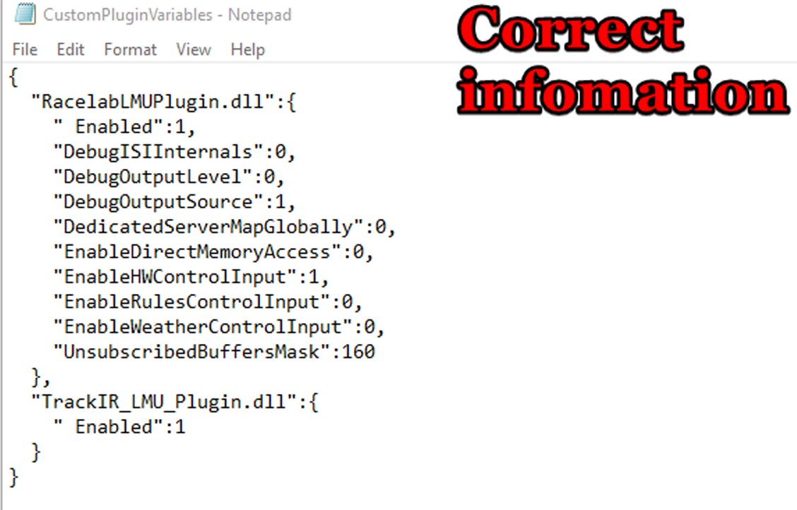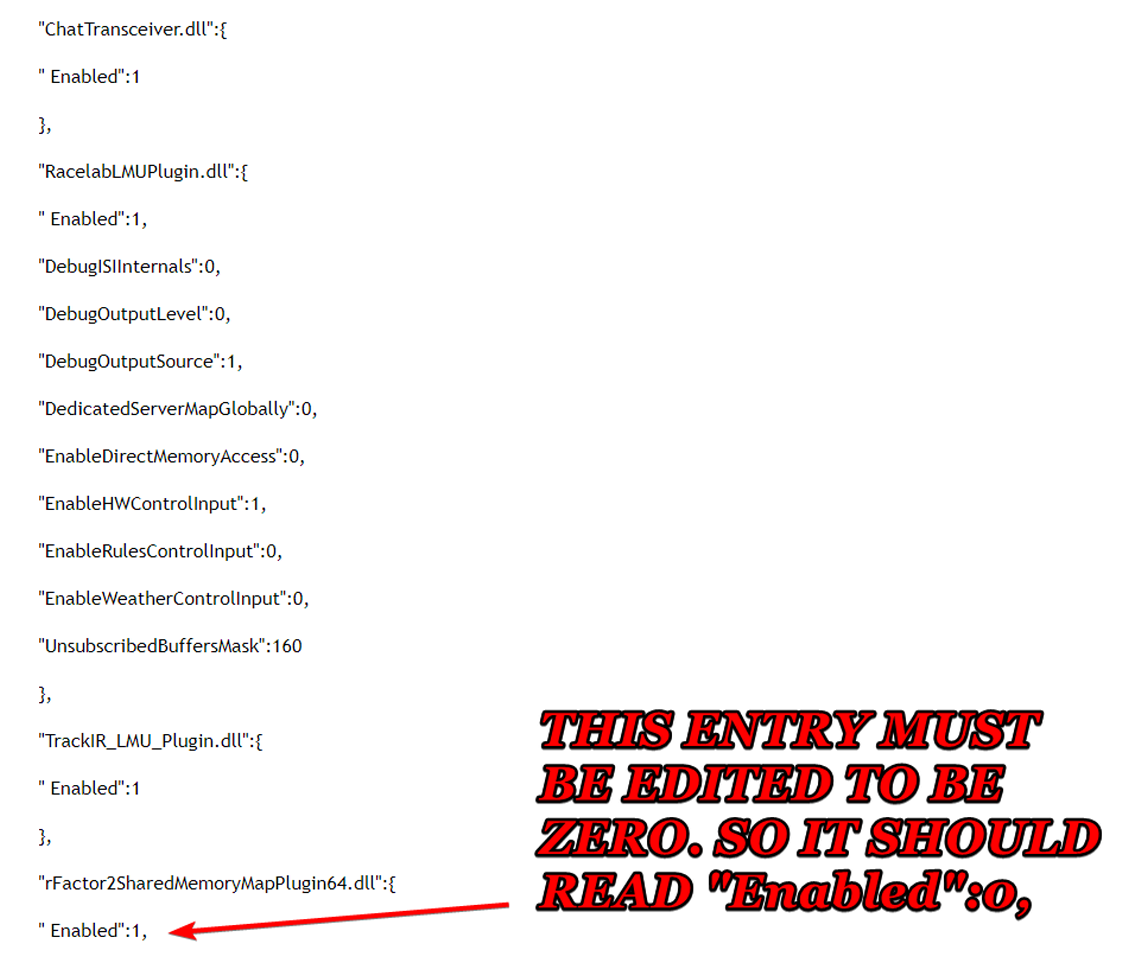 Wenn Sie die CustomPluginVariable.json Datei im Editor öffnen und sehen, dass der Eintrag für Rfactor2SharedMemoryMapPlugin64.dll aktiviert ist, muss er auf 0 UND NICHT auf 1 gesetzt werdenBeispieltext einfach