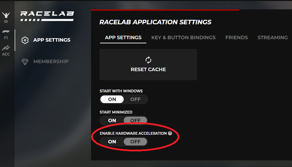 We recommend turning OFF Hardware Acceleration in Racelab. This can be found in settings of the application:
