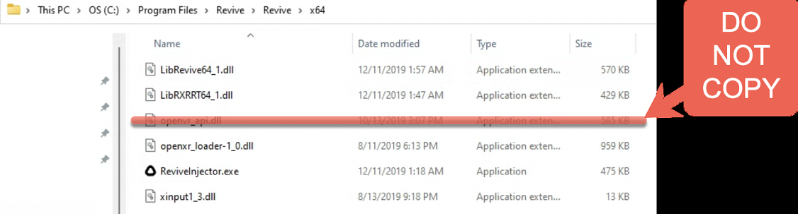 - Once installed, copy only 5 files, all except ‘openvr_api.dll’ from “C:\Program Files\Revive\Revive\x64” to “C:\Program Files(x86)\iRacing” (5 total files as seen below - do NOT copy the file with red line through it)